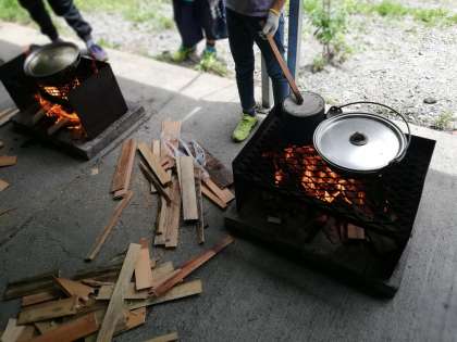 米をとぎ、かまどに火をつけるのですが、なかなか悪戦苦闘です。やっと火がつき、みんなホッと一息です。