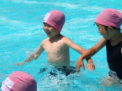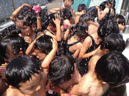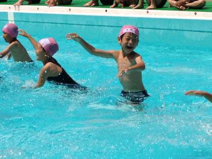 はじめは、少しこわそうにしていた子もいました。でも、水に慣れてくると笑顔がはじけました。今年の1年生には、プールに入れない子は一人もいませんでした。とっても元気で、夏を楽しんでいました。