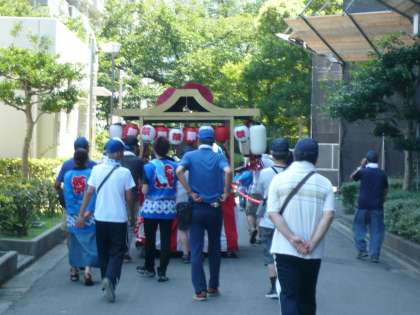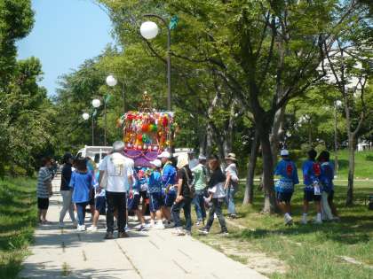 南港北中学校の生徒は神輿を担当し、元気に担いでいました。