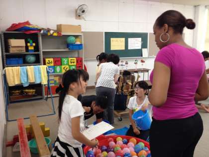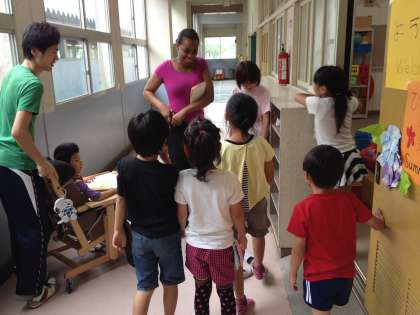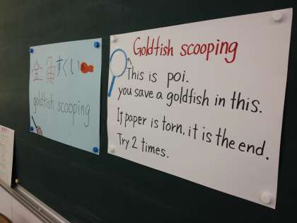 今日は、ひまわり学級のサマーフェスティバルでした。いつもと少し様子が違うのは、あちらこちらに英語の表示があります。C-NETで英語学習の指導をしていただいているスエン先生もお招きしているからです。子どもたちも、いっそう大喜びでした。