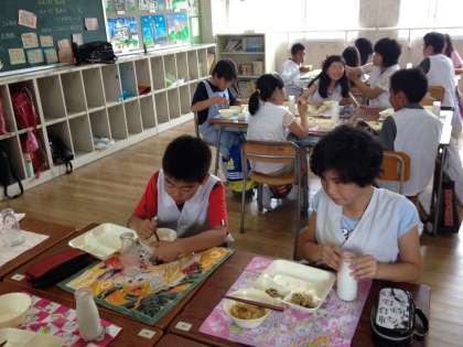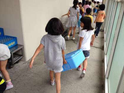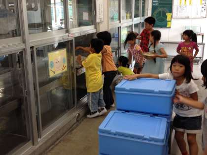 本校の給食は、とってもおいしいです。だから、みんな残さずに食べています。食べ終わったら、給食室まで運びます。調理員さんにお礼を言って、決められた場所に置いていきます。1年生もきちんとできるようになりました。