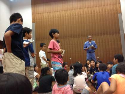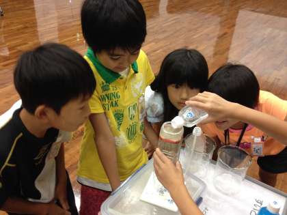 集会室では、上水道の歴史や今の様子を説明していただきました。また、砂で水をろ過するとどれだけ水がきれいになるのかを試しました。泥水が、すっかりきれいになり、においも取れていることに驚いていました。終わりは、質問の時間で、一つひとつにていねいに答えていただきました。