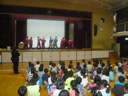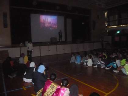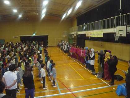 教頭から全校児童にマレーシア国の紹介をし、みんなで本校の校歌を歌いました。その後、マレーシアの子どもたちからマレーシアの踊りを披露してもらいました。2か月間、練習を積み重ねてきたそうで、みごとな踊りでした。