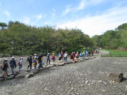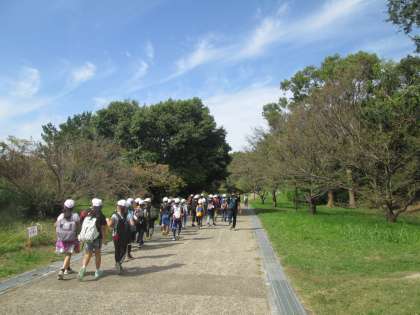 広い緑地を歩いて、お弁当を食べる芝生広場に向かいました。すがすがしい青空と緑いっぱいの緑地内は気持ちがよかったです。