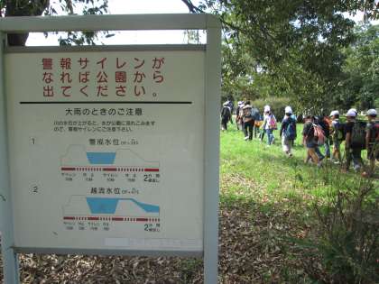 この緑地は看板にも説明があるように、大雨で寝屋川があふれたら、川の水を緑地内に流し込んで貯め、周辺の街を洪水から守る防災設備の役目を果たしています。