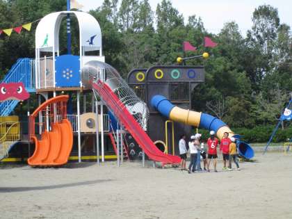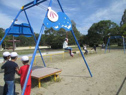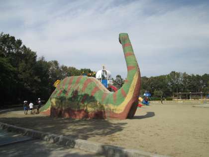 楽しいお弁当・おやつタイムの後は、近くの恐竜広場で遊びました。ここにも遊具がたくさんあり、いっぱい汗をかいていました。