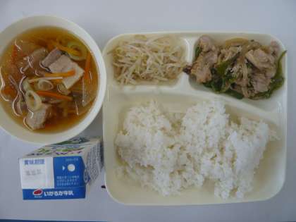 10月22日(月)の給食は「鶏肉のごまだれ焼き」「ソーキ汁」「もやしのしょうがじょうゆあえ」でした。」「ソーキ汁」は沖縄県の代表的な料理です。沖縄県の料理らしく豚肉が味わい深かったです。