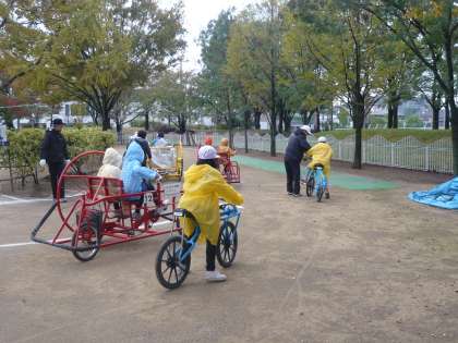 自転車博物館を見学した後は、実際に昔の自転車に乗る体験をしました。今の自転車に比べて大変乗りにくく、ハンドル操作等で戸惑うことも多かったですが、様々な種類の自転車に乗って楽しい体験ができ、みんな大満足でした。この体験の時には雨が上がり、気持ちよく体験ができました。
