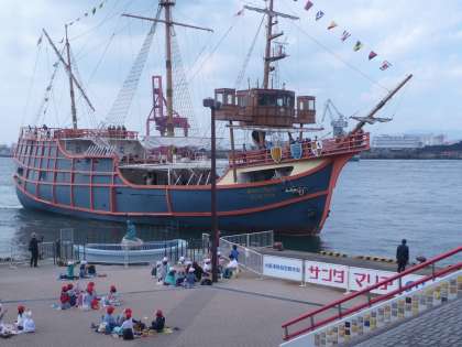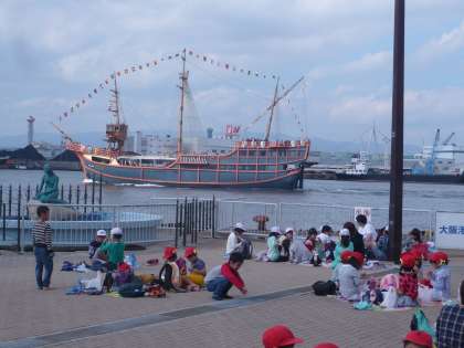 お弁当は海遊館の下の海の見える広場で食べました。サンタマリア号が帰港したり出航したりして楽しいお弁当・おやつタイムが盛り上がっていました。