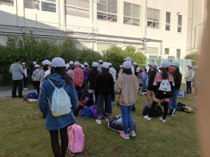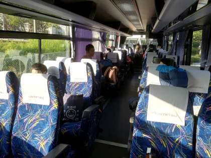 楽しみにしていた修学旅行が始まりました。出発式の後、バスに乗り、出発しました。バスは2台なので、座席には余裕があって快適です。バスレクが始まり、クイズで盛り上がっています。