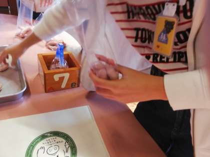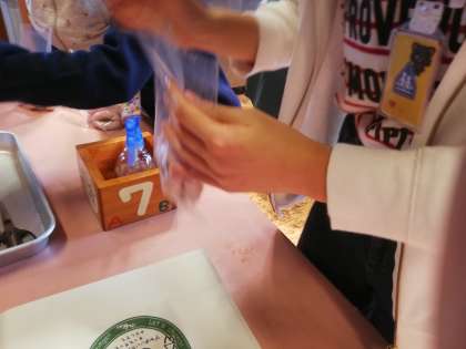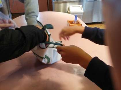 係員さんがボイルしたウインナーをハサミで切って袋に入れます。最後に保冷剤が入った運搬袋に入れます。宅配便で明日に学校に配達され、家に持って帰ります。