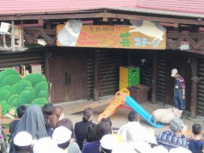 次の活動はミニ豚ショーの見学です。滑り台など楽しいショーに子どもたちは満足です。