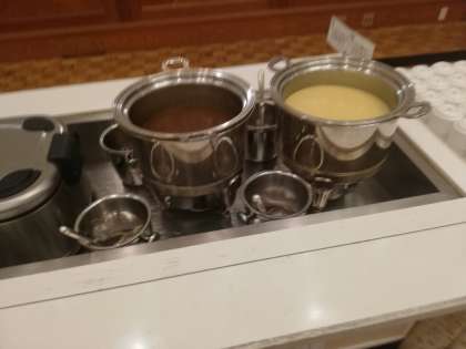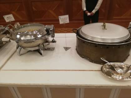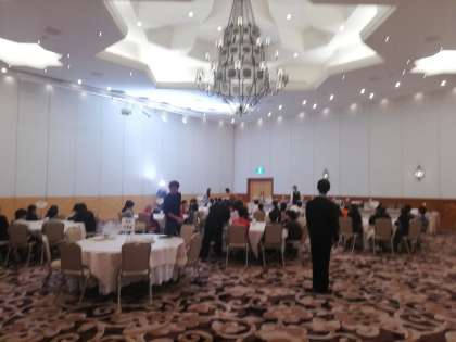 豪華な会場で夕食です。この会場は結婚披露宴で使う部屋です。貸し切りです。メニューはご覧の通り、満足な内容です。