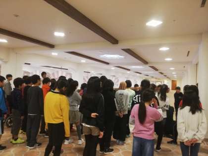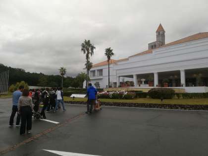 みんな元気に2日目を迎えました。雨なので朝の集いはホテル内で行いました。その後、雨が止んだので、外で記念撮影をしました。ホテル前で会話を楽しんでいます。