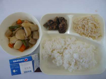 今日の給食は「くじらの竜田あげ」「さといもと野菜の煮物」「もやしのゆずの香あえ」です。給食には年に1回だけ「くじら」の献立が出ます。「くじら」の肉は今は貴重となりましたので、年に1回だけの提供になっています。