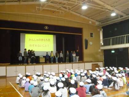 11月22日(木)の児童集会において給食委員会が発表をしました。給食を感謝して残さず食べることを中心に、ビデオでの発表形式で行いました。「いつ、このビデオを撮ったの?」と感心する内容で、委員会の子どもたちだけでなく、先生や給食調理員さんも出演していました。