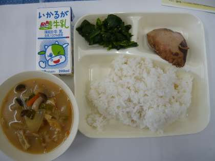 今日の給食は「なまり節のしょうが煮」「みそ汁」「ホウレンソウのごま和え」で完全な和食でした。