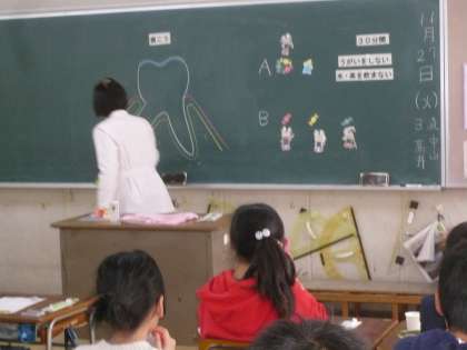 11月27日(火)、4年生はフッ素塗布をしました。これは歯を虫歯から守るための目的です。まず、歯科衛生士の先生から教室で歯の正しい磨き方の指導をしていただきました。子どもたちはしっかり話を聞き、丁寧に歯を磨いていました。その後に保健室に移動し、歯科医師から歯にフッ素を塗布していただきました。これからもしっかりと歯を磨き、虫歯を防いでいってほしいと願っています。