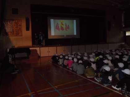 12月6日(木)、児童集会において児童放送委員会が活動発表をしました。内容は昔話の「かぐや姫」の朗読です。自分たちで描いた絵をバックに昔話の「かぐや姫」を原作通りに朗読していきました。わかりやすい絵や上手な朗読など感心する発表となりました。