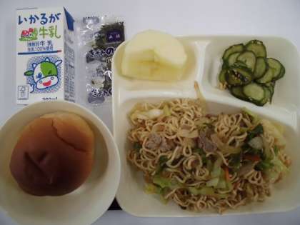 授業で説明のあった今日の給食は「オイスターソース焼きそば」「きゅうりの中華あえ」とデザートにリンゴが出ました。黒糖パン、牛乳と合わせて栄養のバランスをよく考えている献立です。