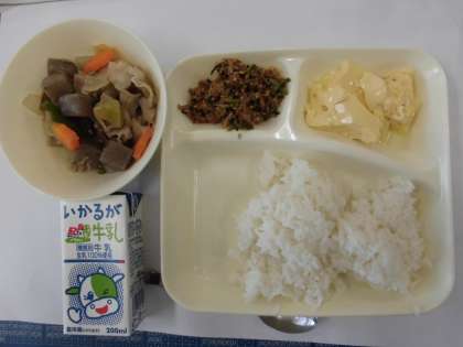 なお、今日の給食は「「卵どうふ」「豚肉とさといもの煮物」「おかかなっ葉」です。