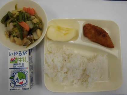 2学期も残り少なくなってきました。給食は今日を入れてあと2回となりました。今日の献立は「あつあげと野菜の煮物」「タラのフライ」で、デザートにリンゴが付きました。