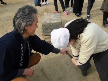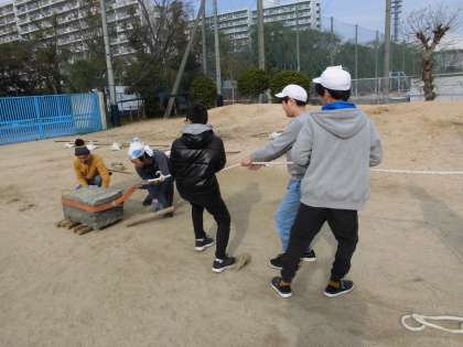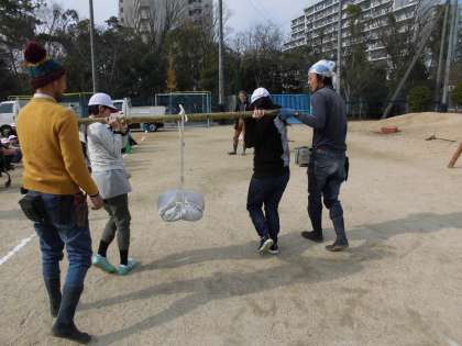 1月8日(火)、南港にある造園会社の方々に来ていただき、造園についての出前授業をしていただきました。大きく重い石をどのようにして運ぶか等、てこや棒を使って体験をしました。まだ、てこの学習はしていませんが、支点・力点・作用点について学び、位置関係が変わると、体にかかる重さが大きく変わることを実感することができました。やがて理科の学習で「てこ」について学びますが、今回の出前授業での体験が生かされると思います。