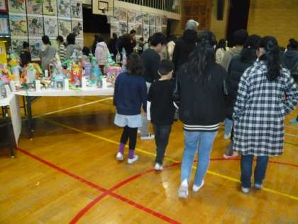 1月12日(土)、土曜授業で図工の作品展を鑑賞しました。ペア学年になって作品の鑑賞を行いましたが、はじめに学年の代表が作品の工夫や頑張ったことをアピールしました。その後、ペアで各学年の作品展を鑑賞していきました。