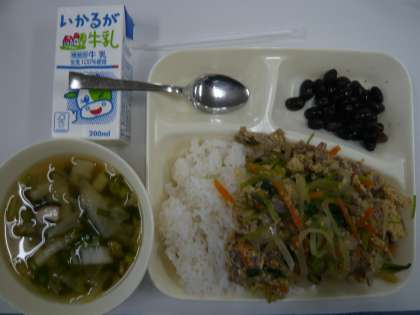 今日の給食は「他人丼)「すまし汁」「黒豆の煮物」です。「黒豆の煮物」はお正月に食べた子どもたちもいることだと思います。