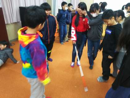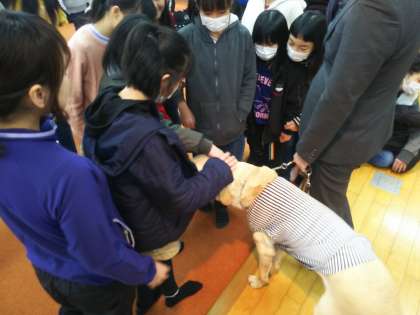 また、視覚障がい者や盲導犬との接し方についても教えていただきました。ハーネスを外したソニックは、「今は休憩〜♪」と言わんばかりに頭やしっぽをふっていました。子どもたちも、ソニックや白杖に触れて、濱田さんの気持ちを感じていました。