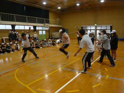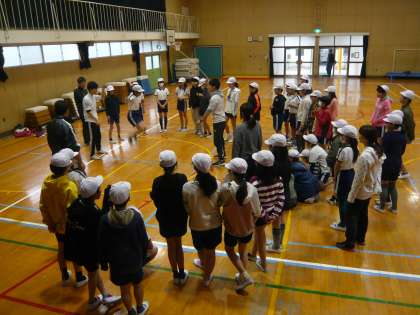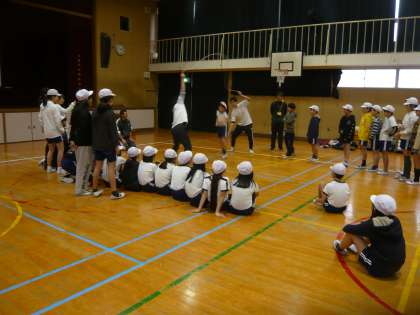 2月21日(木)、大阪府ダブルダッチ協会から理事長・理事の二人をお招きし、ダブルダッチ(縄跳び)を教えてもらいました。ダブルダッチ(縄跳び)とは、通常1本の長縄を2本回し、跳んでいく長縄跳びのことです。はじめはリズムがつかみにくくて苦労していましたが、指導者の丁寧な指導のおかげで、リズムをつかみ次々に跳べるようになりました。跳んでいる児童に周りの児童がリズムの声をかけ、仲良く助け合っていました。その姿に指導者の方から、「みんな仲良く助け合っていて、こんな学校はめずらしい」とお褒めの言葉をいただきました。校長室での接待が終わり、運動場を見ると、さっそく子どもたち同士でダブルダッチをしている姿が見え、指導者の方は感動して帰られました。