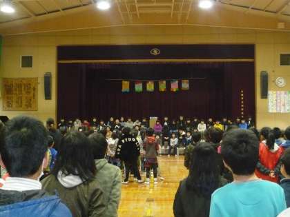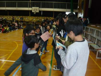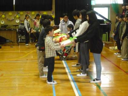 各学年からの発表後は、在校生でグリーンの「キセキ」を歌いました。その後、1年生が代表して6年生にメッセージカードを渡し、6年生からは雑巾のプレゼントの贈呈がありました。