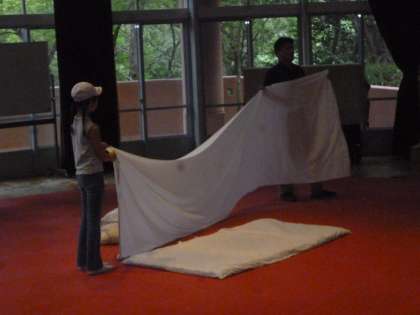 宿舎ではすべて自分でします。ふとんやシーツのたたみ方も教わりました。いよいよ部屋に移動です。