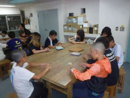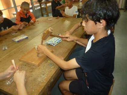 次に、スプーンの金属の部分を今つるつるにした木の棒につけます。木づちでたたいてつなげます。