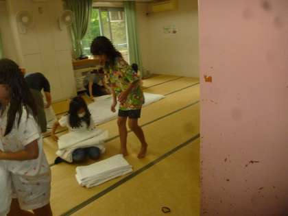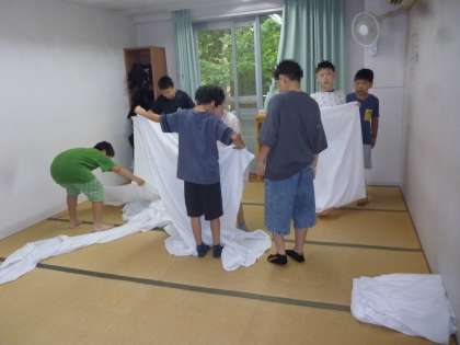 部屋の整理。シーツも協力してたたみ、片づけます。