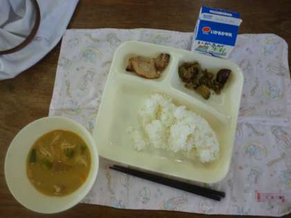 今日のこんだては、鶏肉のてり焼き・とうがんのみそ汁・なすのそぼろいためです。とうがんのみそしるは、他にもオクラなどが入っており、とろみがあっておいしかったです。
