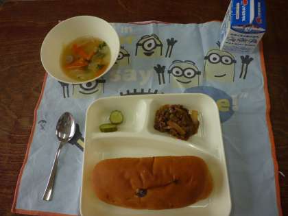 今日のこんだては、牛肉のデミグラスソース煮・ウインナーのスープ・きゅうりのピクルスです。牛肉のデミグラスソース煮は、あまずっぱいソースが子どもにちょうどいい味のこさで、人気でした。