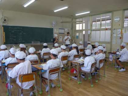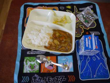 今日のこんだては、チキンカレーライス・キャベツとコーンのサラダ・ミニフィッシュです。チキンカレーライスは、子どもにちょうどいいからさで大人気でした。