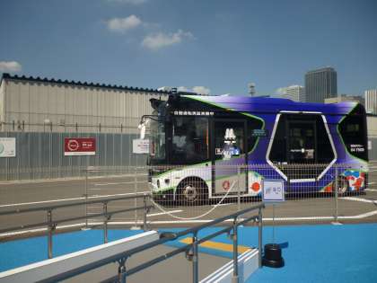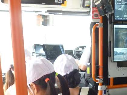 自動運転電動バスに乗りました。運転席をのぞかせていただき、自動で運転しているところを見ることができました。