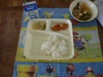 きょうのこんだては、ヤンニョムチキン・とうふのスープ・きりぼしだいこんのナムルです。ヤンニョムチキンは、あまからいあじつけがこどもたちにこうひょうでした。