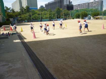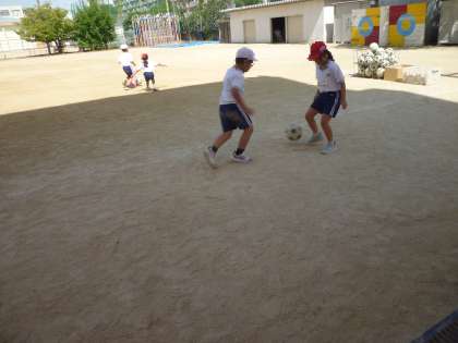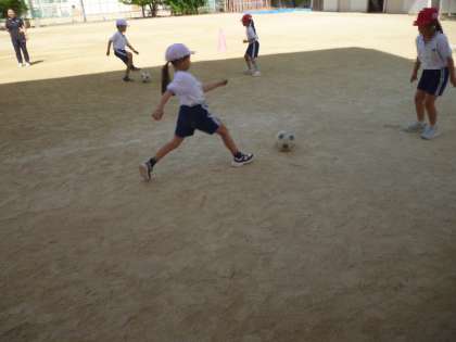 あいてを見ながら、ボールをけり、かわしています。ディフェンスがわもチームワークがよく、ゴールをまもっています。