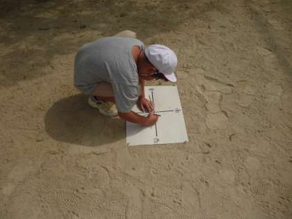 太陽の動きを「かげ」の動きで調べています。休み時間にも記録しています。