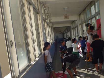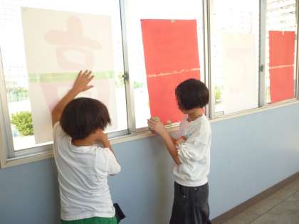 運動会に向けて、委員会活動の準備も進んでいます。運動会のめあてを校舎の窓にはっています。
