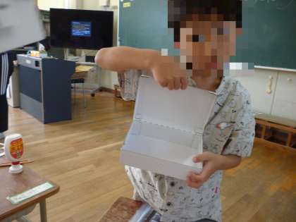 カギつきのはこです。きょうは、はこのくみたてと、カギをつくりました。