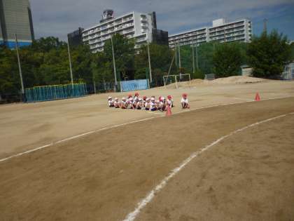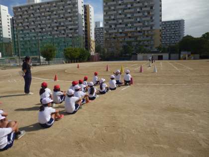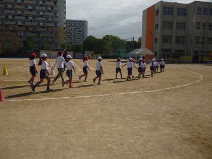 うんどうじょうで、いどうのれんしゅうをしました。1・2年生は、かけっこ・だんたいえんぎ・だんたいきょうぎをします。