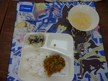 今日のこんだては、大豆入りキーマカレーライス・キャベツのひじきドレッシングです。キーマカレーは、子どもたちに大人気で、どのクラスも完食でした。