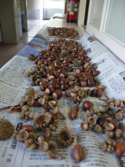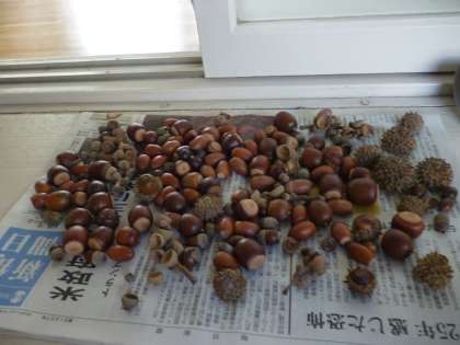 せんしゅうの金ようびに、こうえんで見つけてきたどんぐりです。かわかしているところです。