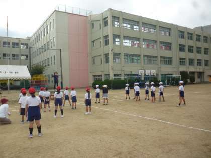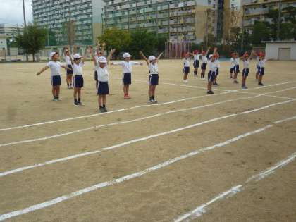 1・2年生がうんどうじょうで、こうかをげんきよくうたっています。また、ラジオたいそうのれんしゅうをしました。うんどうかいとう日にむけ、いっしょうけんめいれんしゅうしています。