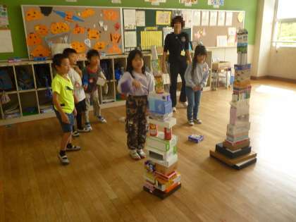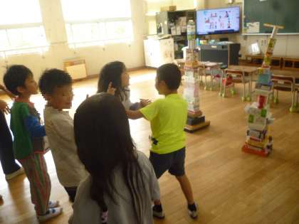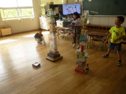 たかくつむなかで、おなじようなかたちのものや、たかさがおなじものをつんでいきました。にているかたちのものをみつけながらつむことで、よりたかくつむことができることにきづきました。