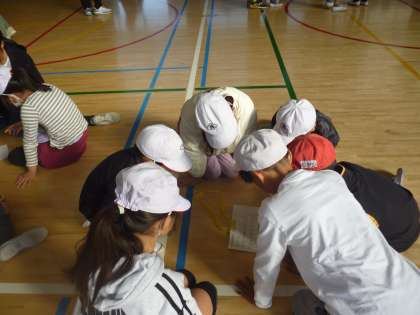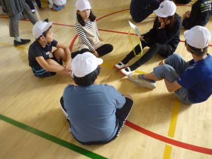 光ハイクは、地域の皆さんやPTAの方、教職員がお店を学校だけでなく、学校周辺の公園などにも出店します。そして、たてわり班でまわっていきます。今日は、お店をまわる順番をみんなで決めました。